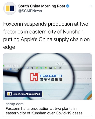 FX168财经报社(香港)讯 据香港《南华早报》周一(4月25日)报道称,全球最大的电子产品合同制造商、苹果(Apple)主要供应商富士康科技集团(Foxconn Technology Group)已暂停其位于中国东部城市昆山的两家工厂的生产,令这家美国科技巨头在中国大陆的供应链面临进一步压力。