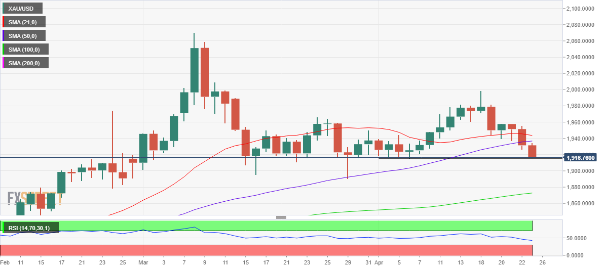 24K99讯 周一(4月25日)欧市早盘,现货黄金维持跌势,目前略高于1915美元/盎司,金价日内大跌逾15美元。知名财经网站FXStreet分析师Dhwani Mehta周一最新撰文,对金价技术前景进行分析。Mehta指出,假如金价跌破1915美元/盎司并保持在该位下方,金价恐进一步大跌至1900美元/盎司。