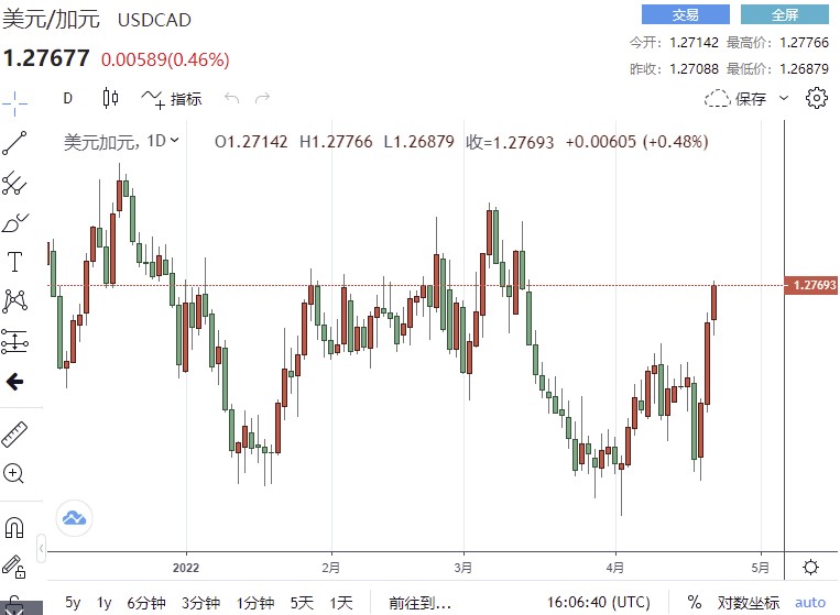 周一截止发稿,美元兑加元USD/CAD日内涨幅扩大至0.46%,现报1.2767。