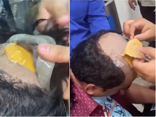 德里海关分享的一段视频显示,他的假发被剪掉,露出了粘在他秃顶上的一小袋融化的黄金。