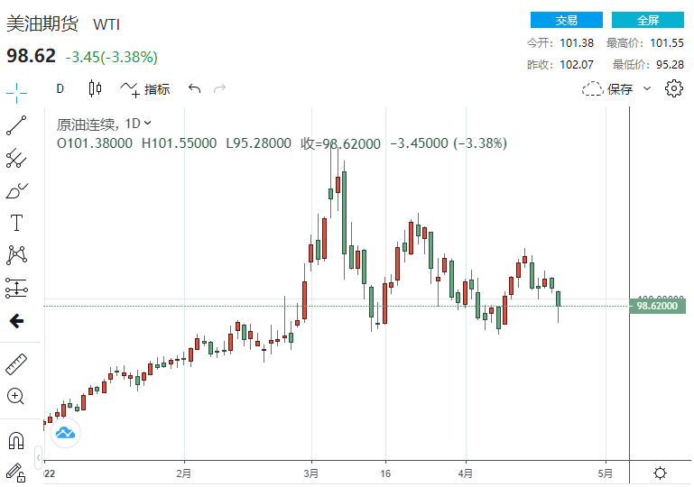 截至发稿,美国WTI原油期货下行3.09美元,跌幅3.04%,现报98.34美元/桶;布伦特原油期货下探3.82美元,跌幅3.58%,报102.28美元/桶。在上周下跌近5%后,这两个原油基准指数均收于4月11日以来的最低点。自3月初飙升至2008年以来的最高水平以来,价格已下跌约 25%。同时,这也促使美国投机者上周将其净多头期货和期权头寸削减至2020年4月以来的最低水平。上周纽约商品交易所WTI期货的未平仓合约跌至2016年7月以来的最低水平,而每日期货交易量降至今年以来的最低水平。