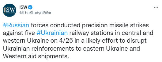 FX168财经报社(香港)讯 俄乌战争进入新一阶段的军事行动,美国智库Institute for the Study of War(ISW)在其最新分析中表示,俄罗斯军队25日精准打击乌克兰中部与西部的5个火车站,破坏西方援助的运输。智库分析认为,这是美国国务卿与国防部长访问基辅所造成的。