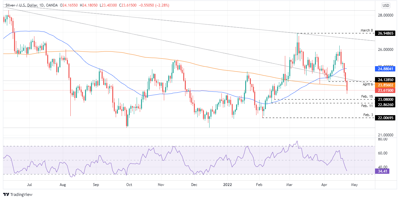 24K99讯 因美元大幅上涨,加之市场对北京因新冠疫情而封锁的担忧加重,现货白银价格周一(4月25日)大跌逾2%,收报23.61美元/盎司。知名财经网站FXStreet分析师Christian Borjon Valencia周二最新撰文,对白银技术前景进行分析。根据Valencia,由于银价日收盘位于200日均线下方,银价将延续跌势。