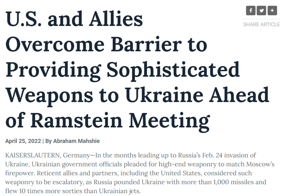 FX168财经报社(香港)讯 来自40多个国家的官员将齐聚德国拉姆施泰因(Ramstein)空军基地,参加由美国主持的会谈,预计将集中讨论如何武装基辅以抵御俄罗斯在乌克兰东部的猛攻。美国参谋长也示警,未来几周的俄乌战事非常关键。