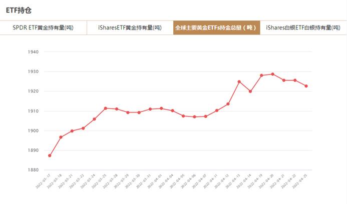 根据黄金信息网站www.24K99.com对全球8大主要黄金ETF的监控数据显示,截至2022年4月25日,全球8大黄金ETFs持仓总量为1922.647吨,与上一交易日减少2.9吨。