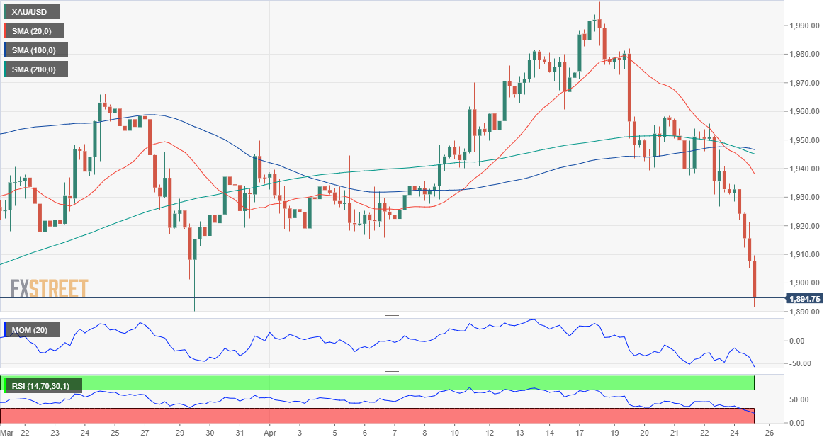 24K99讯 周二(4月26日)亚市盘中,现货黄金基本持稳,仍位于1900美元/盎司关口下方;昨日金价暴跌逾30美元。FXStreet首席分析师分析师Valeria Bednarik最新撰文,对金价走势进行分析。Bednarik指出,从技术面来看,黄金前景看空。
