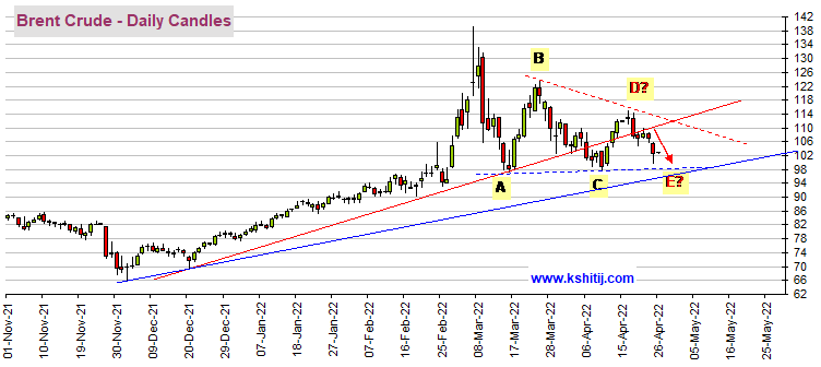 原油方面,Kshitij咨询服务团队表示,布伦特原油期货一度测试102.20美元/桶,然后小幅上涨。我们继续预计布油将测试短期支撑位98美元/桶,假如守住该位,这可能推动布油在未来几个交易日反弹向110-112美元/桶。一个可能的三角形态已经形成,将在大幅突破110-112美元/桶时得到验证,若如此,中期内布油将再次涨向120-125美元/桶、甚至更高水平。