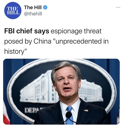 美国《国会山报》报道称,克里斯托弗·雷在接受哥伦比亚广播公司(CBS)《60分钟》(60 Minutes)节目采访时说:“从反间谍的角度来看,我们作为一个国家面临的最大威胁来自中国。”