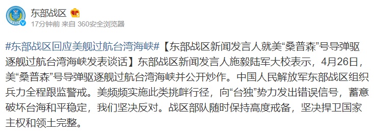 根据解放军东部战区4月27日最新消息,东部战区新闻发言人施毅陆军大校表示,4月26日,美“桑普森”号导弹驱逐舰过航台湾海峡并公开炒作。中国人民解放军东部战区组织兵力全程跟监警戒。