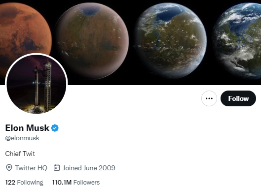 FX168财经报社(香港)讯 特斯拉创始人马斯克在27日,将其推特账户简介修改为Chief Twit。与此同时,有消息称马斯克将于周五在推特办公室对该公司员工发表讲话。
