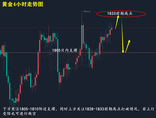 黄金技术面来分析,日线上,上周五黄金延续前一个交易日涨势再次依托MA5日均线展开上行,盘中录得中阳,日线上,目前黄金处于高位运行,仍有望冲击周内高点;4小时上,上周五黄金早盘短暂触及MA10日均线后回升,呈缓慢不断上涨,盘中多次上破上轨后回落,当前布林带处于开口期,MA均线向前延伸,KDJ随机指标三线向上,到达超买,MACD指标红色动能柱持续放量,快慢线金叉向上,综合来看,黄金目前短期多头强劲,但不可高点追多,明日建议等待跌至1805-1810附近支撑做多,同时上方关注1828-1833前期高点阻力,若上涨触及受阻也可进行做空,同时关注上下突破情况进行调整即可。