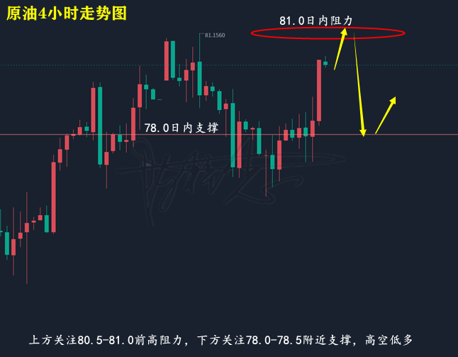 原油技术面来分析,日线上,上周五原油上演触低反弹,盘中刺破MA10日均线后回升,并扩大涨幅,录得带下影线的中阳,日线上,原油打破连阴下行展开回升,尽管上涨,但并未打破关键压力点位;4小时上,上周五原油在经过短暂的低位震荡后刺破80关口,并持于均线上方运行,当前布林带处于开口期,MA均线走出双金叉,KDJ随机指标三线向前,到达超买,MACD指标红色动能柱开始放量,快慢线金叉向上,综合来看,尽管原油在周尾上涨,但周线*依旧存在,同时也未打破前高下周建议上方关注80.5-81.0附近阻力做空,下方关注78.0-78.5附近支撑,同时关注上下突破情况进行调整即可。