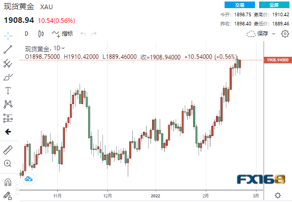 美市尾盘,现货黄金收报1908.94美元/盎司,上涨10.54美元或0.56%,日内最高触及1910.42美元,最低触及1889.46美元。