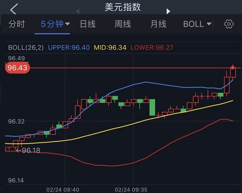 美元指数短线快速拉升,现报96.44。