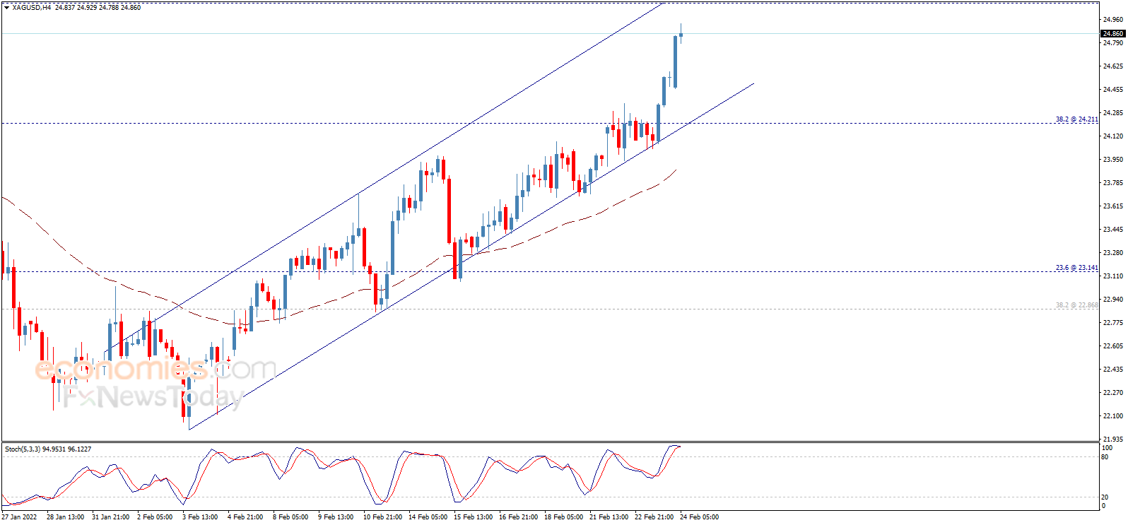 24K99讯 周四(2月24日)亚市尾盘,因俄乌开战令市场避险情绪急剧升温,现货白银大幅上涨,银价现报25.00美元/盎司附近,日内飙升近2%。知名财经资讯网站Economies.com周四最新撰文,对日内白银走势进行前瞻分析。