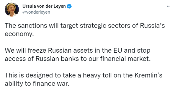冯德莱恩表示:“我们将封锁俄罗斯经济战略部门,阻止他们获得关键技术和市场。普京总统要为将战争带回欧洲负责,我们将削弱俄罗斯的经济基础和现代化能力。欧盟将冻结俄罗斯在欧盟的资产,并停止俄罗斯银行进入欧洲金融市场。”