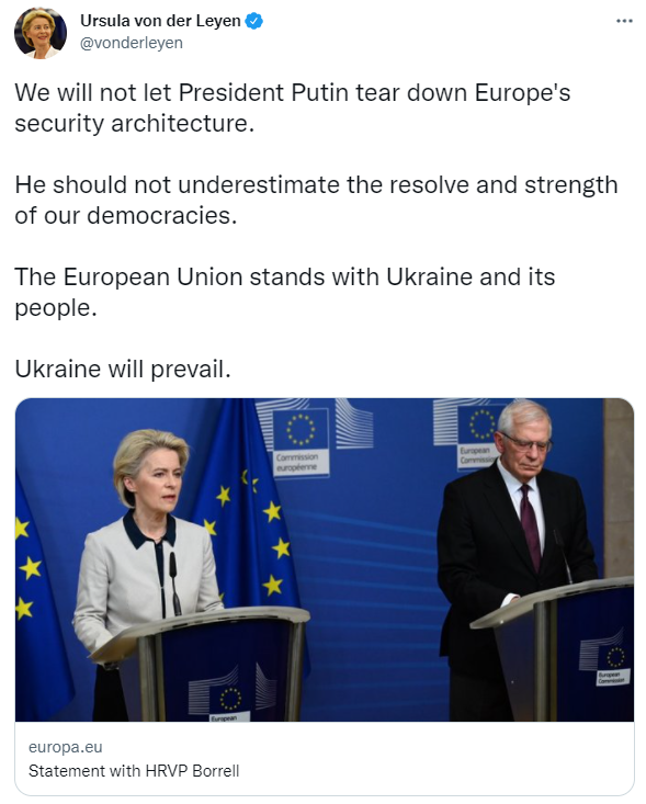 同一时间,冯德莱恩在社交媒体上表示,强烈谴责俄罗斯对乌克兰的“不正当攻击”,欧盟将追究俄罗斯的责任。