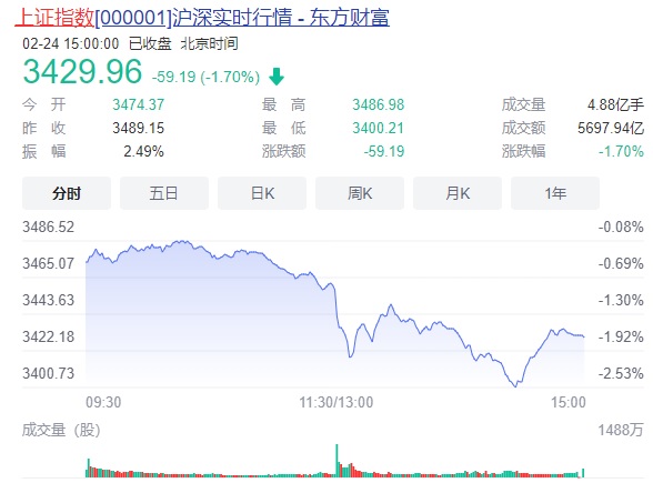 截止收盘,上证指数报收3429.96点,下跌59.19点,跌幅1.7%。深证成指报13252.24点,下跌297.75点,跌幅2.2%。创业板指报收2783.90点,下跌59.97点,跌幅2.11%。